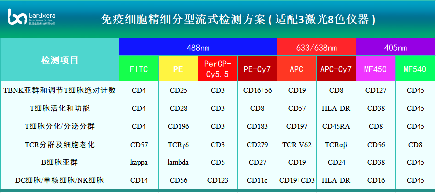 巴德生物参照多篇专家共识的免疫细胞精细分型检测方案,并结合本公司优选流式抗体,给出以下六色/八色/十色方案。